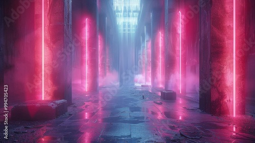 © Teerasak, Obraz premium Futuristic equalizer bars in a neon lit space.