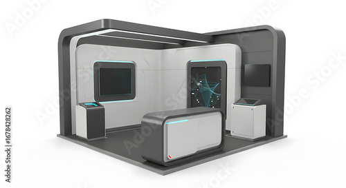 Fototapeta premium Futuristic exhibition booth design with interactive displays showcasing modern technology solutions