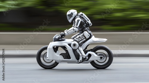 © Ratchadaporn, Fototapeta premium Futuristic exoskeleton powered soldier riding a high tech agile battlefield motorcycle at breakneck speed through a chaotic action packed military setting This image showcases the power strength