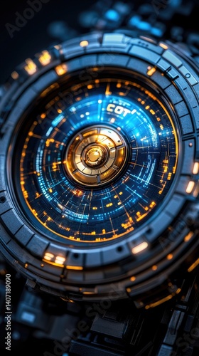 Obraz premium Futuristic eye featuring intricate blue and orange glowing details and metallic texture