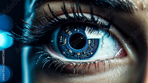 © Graphics.Parasite, Fototapeta premium Futuristic Eye with a Digital Rainbow Iris and Holographic Lights Ai Generated