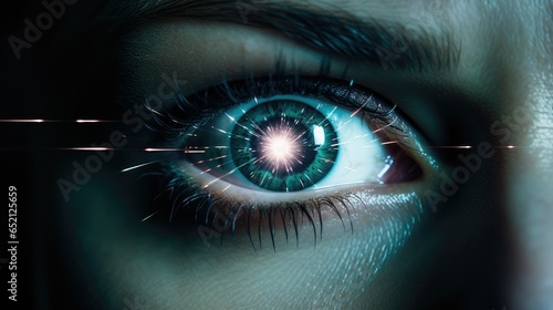 Fototapeta premium Futuristic eye with lasers and unique building implanted technology....