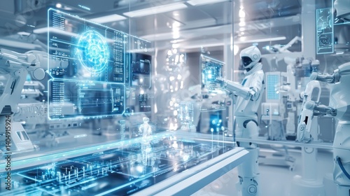 © San, Fototapeta premium Futuristic Factory: A Humanoid Robot Interacts with Advanced Holographic Technology