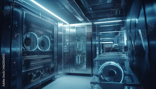 Fototapeta premium Futuristic factory machinery working inside modern steel warehouse with...