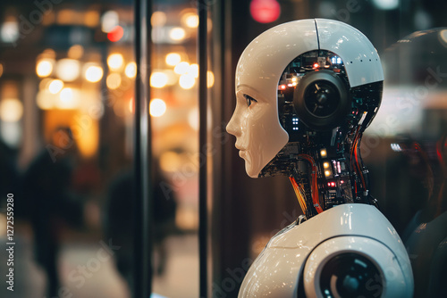 Fototapeta premium Futuristic Female Android Display at Urban Tech Exhibition
