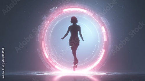 © Futuristictech, Naklejka premium Futuristic Female Character Avatar Stepping into Digital Portal