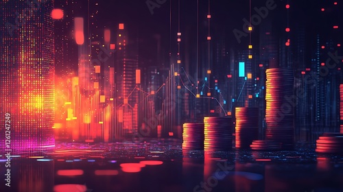 Obraz premium Futuristic Financial Growth Visualization, A digital representation of financial growth, featuring stacks of coins, glowing graphs