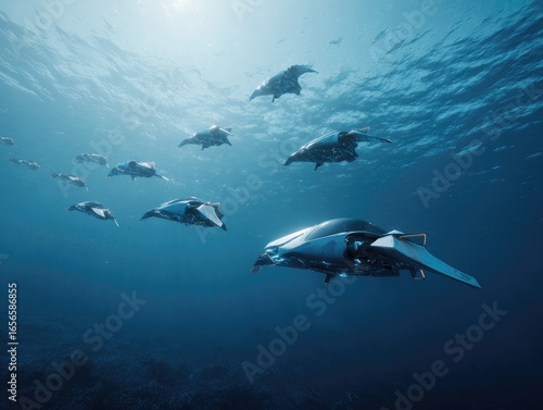 © Imbo, Fototapeta premium Futuristic fleet of underwater vehicles gliding through deep blue ocean