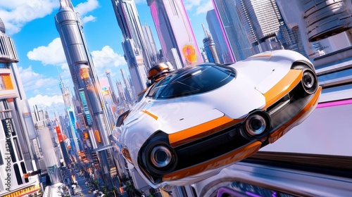 © Sakdecha, Obraz premium Futuristic Flying Car Over Modern Cityscape with Bright Towers
