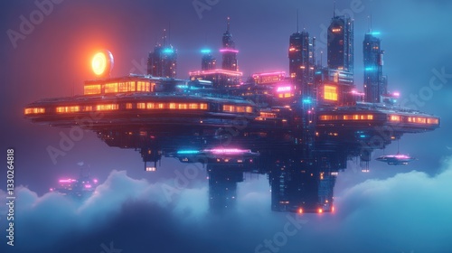 Fototapeta premium Futuristic flying city with floating platforms, neon lights, and space ships