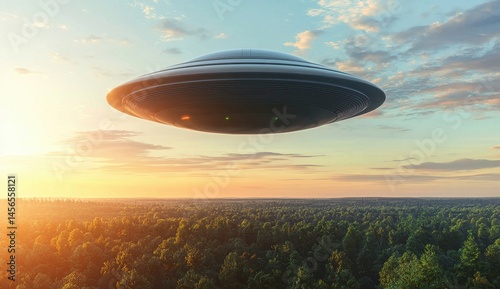 © warunthorn, Fototapeta premium Futuristic Flying Saucer Over Lush Green Forest at Sunset