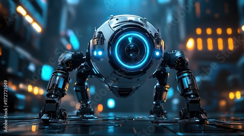 Fototapeta premium Futuristic four-legged robot with glowing blue eye standing in high-tech...