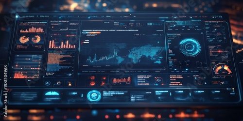 Obraz premium Futuristic Global Data Interface with World Map and Analytics