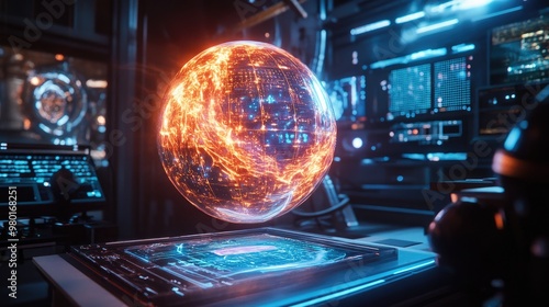 © Sumet, Naklejka premium Futuristic globe display with vibrant energy, set in a high-tech environment showcasing advanced technology and digital interfaces.