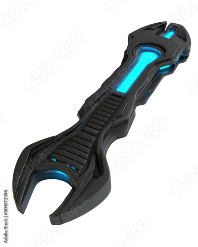 © Husna, Obraz premium Futuristic Glowing Blue Wrench on Dark Background