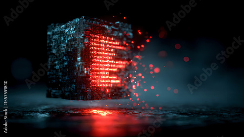 © eraStocks , Obraz premium Futuristic glowing data cube with red digital code and particle sparks in dark cyber environment, perfect for artificial intelligence, technology, and sci-fi themes