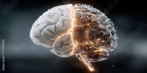 © keks20034, Fototapeta premium Futuristic glowing digital hologram of a brain emerging from a computer microchip. Concept of artificial intelligence