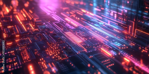 © kwanchaift, Naklejka premium Futuristic glowing firewall with complex circuitry, neon light reflecting off the digital barrier, protecting streams of data
