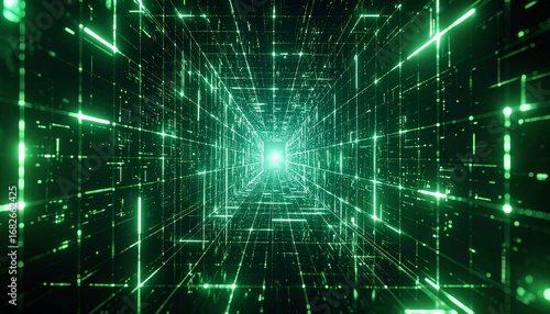 Fototapeta premium Futuristic glowing green digital tunnel with interconnected grid lines and...