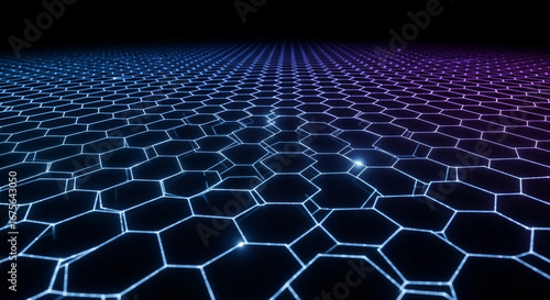 © Artistic Visions, Naklejka premium Futuristic glowing hexagonal grid network pulses with vibrant blue and purple light on dark background