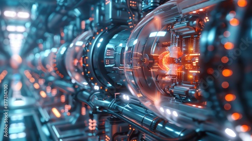 Fototapeta premium Futuristic, glowing, intricate machinery with a glowing orange core. Abstract...