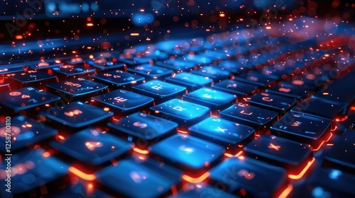 Obraz premium Futuristic glowing keyboard with vibrant blue and red lights, sparks, and...