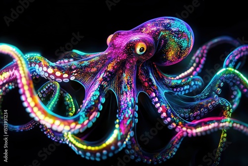 © Thomas, Obraz premium Futuristic glowing neon octopus with colorful tentacles in fantasy ocean artwork