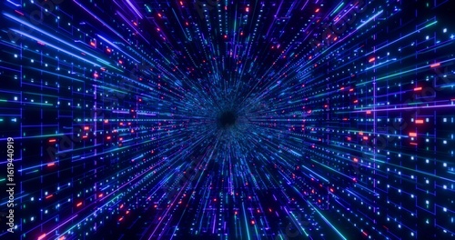 © FlatFloatCreation, Naklejka premium Futuristic glowing neon waving rays background. Shining geometric blue lines and grid inside corridor in perspective. Bright retro digital cyberspace. 3D rendering.