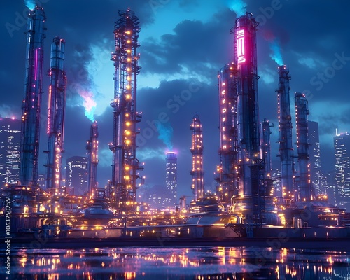 Fototapeta premium Futuristic Glowing Oil Refinery Cityscape with Sleek Metallic Structures...