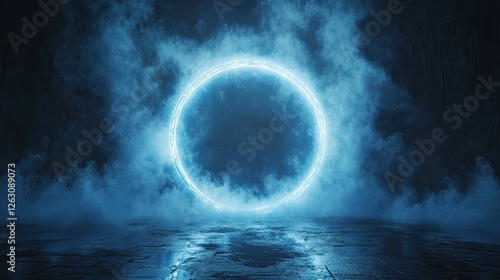 Fototapeta premium Futuristic glowing ring emerging from mist, symbolizing technology and mystery.