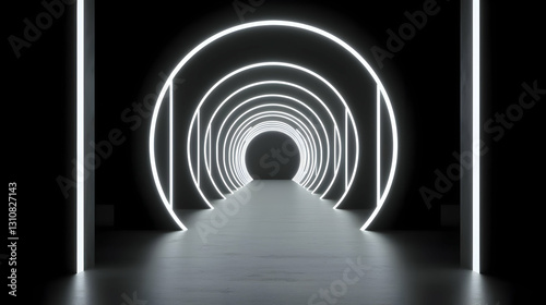 © Surachate, Naklejka premium Futuristic glowing tunnel with neon rings in dark space