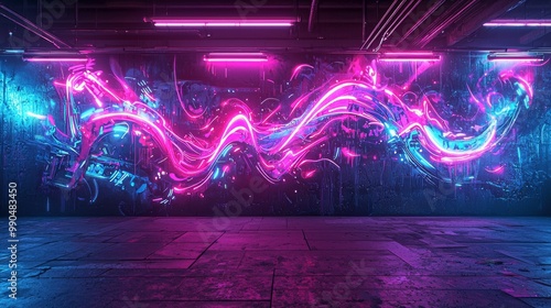 Naklejka premium Futuristic graffiti wall, cyberpunk style street art
