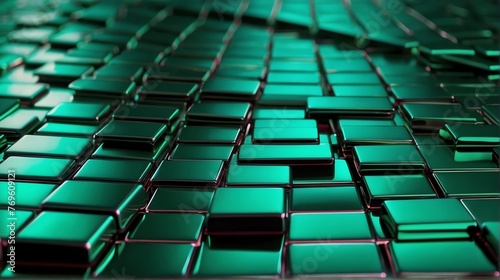 © Arceli, Fototapeta premium Futuristic green shiny metallic square rectangular geometric sheets pattern background abstract minimalist modern technology from Generative AI