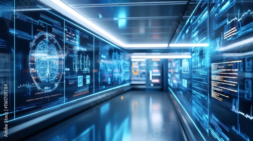 Fototapeta premium Futuristic hallway with glowing screens and digital interfaces.