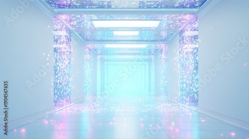Fototapeta premium Futuristic Hallway with Holographic Effects: Clean, Modern Architecture with Digital Light and Creative Design Elements