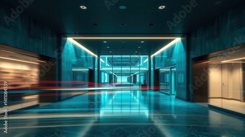© VibrantLens, Fototapeta premium Futuristic hallway with neon blue lights.
