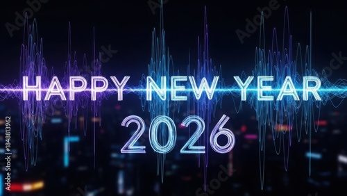 Fototapeta premium Futuristic 'Happy New Year 2026' Greeting with Neon Equalizer Audio Wave and Dark City Background