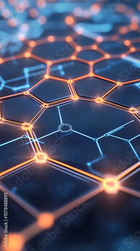 © Ussadang, Obraz premium Futuristic hexagonal pattern filled with thin lines interconnecting glowing hexagons. In this background, hexagons represent digital interfaces or tech systems.