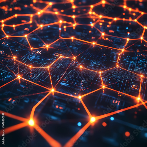 © Ussadang, Fototapeta premium Futuristic hexagonal pattern filled with thin lines interconnecting glowing hexagons. In this background, hexagons represent digital interfaces or tech systems.