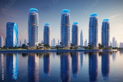 Naklejka premium Futuristic High-Rise Buildings in a Smart Urban Environment with Reflective Water Features and Vibrant Blue Aesthetic