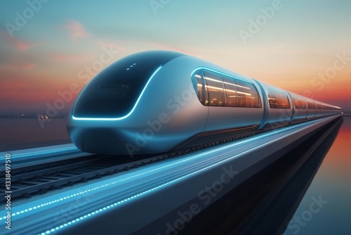© ChaoticMind, Obraz premium Futuristic high-speed train gliding along a sleek track during a vibrant sunset by the waterfront