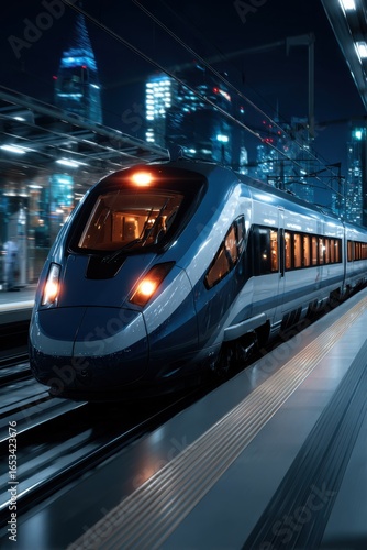 Fototapeta premium Futuristic high-speed train gliding through a vibrant cityscape with glowing...