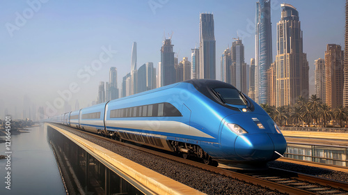 Naklejka premium Futuristic High-Speed Train in Dubai's Stunning Skyline: A Journey into the Future of Travel