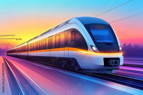 Naklejka premium Futuristic High-Speed Train Soaring Across Tracks at Sunrise