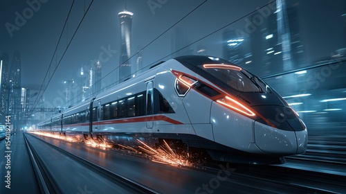 Fototapeta premium Futuristic high-speed train speeding through a modern city at night