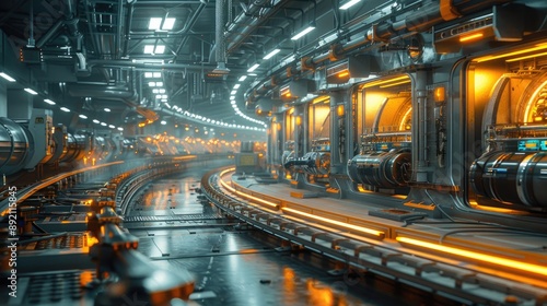 © Vilaysack, Obraz premium Futuristic, high-tech industrial facility illuminated with bright orange and blue lights, showcasing advanced machinery and engineering excellence.