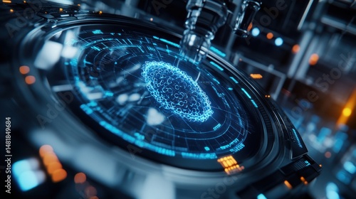 Fototapeta premium Futuristic, high-tech interface with data visualization. A complex system of interconnected components, showcasing advanced technology. The graphic interface displays a central sphere of data points