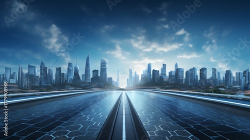 © Studicon, Fototapeta premium Futuristic highway leading to a modern city skyline under a bright blue sky