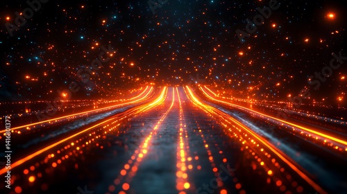 Obraz premium Futuristic highway of orange light streaks through a starlit night sky.