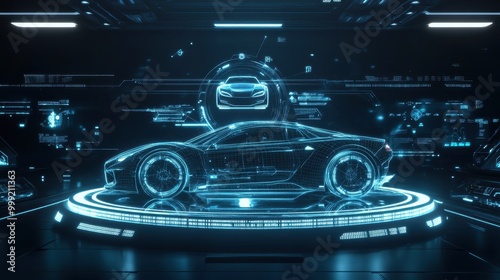 Obraz premium Futuristic Holographic Car Design with Blue Neon Lights and Digital Interface...